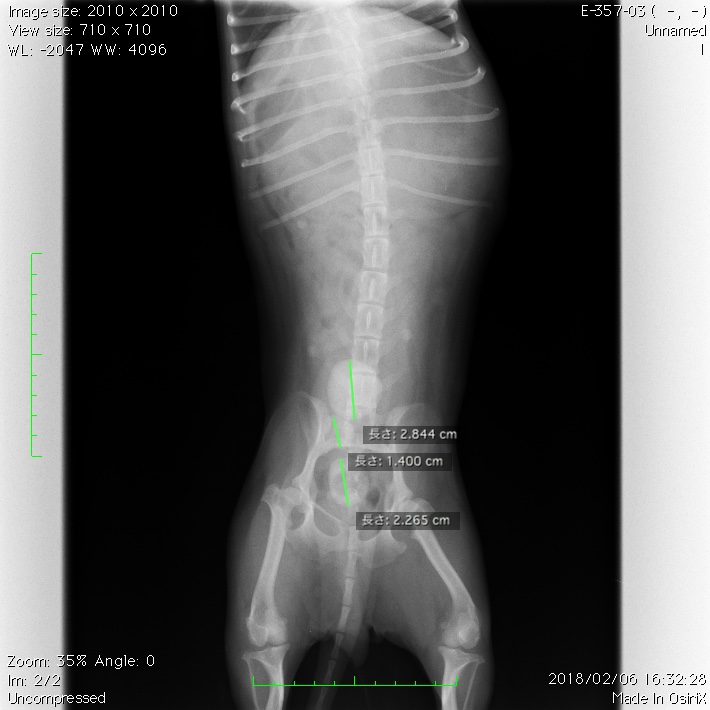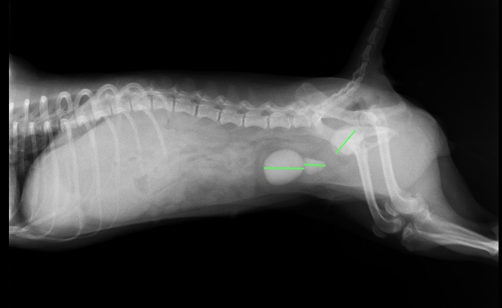 レントゲン検査では膀胱内に、3つのX線不透過性の物体が確認されました。(写真1、2)