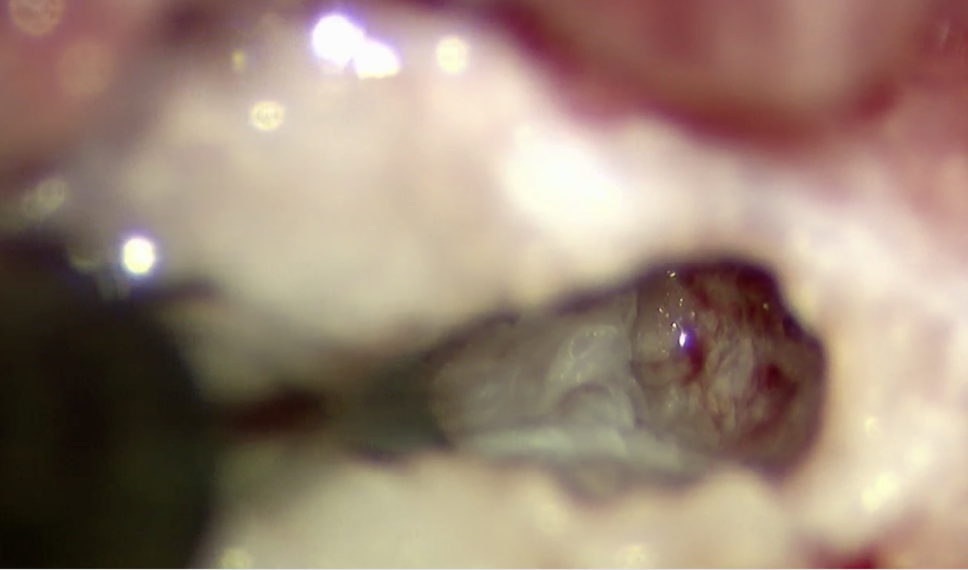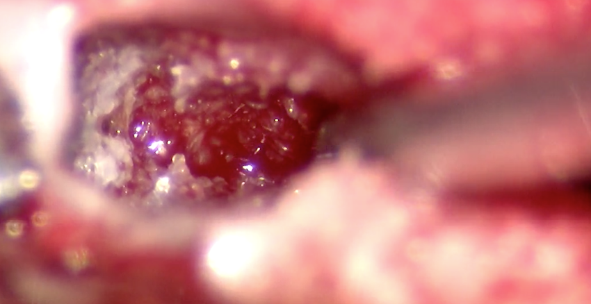 今回の症例では骨の幅が9mmであり、削る幅の最大径が3mmでした。それ以上の幅で削ると不安定性が出て合併症のリスクが高くなります。3mmの幅の内部での操作となるため、肉眼での操作は困難であり、顕微鏡操作が有用となります。以下は顕微鏡下での術野の視野になります。