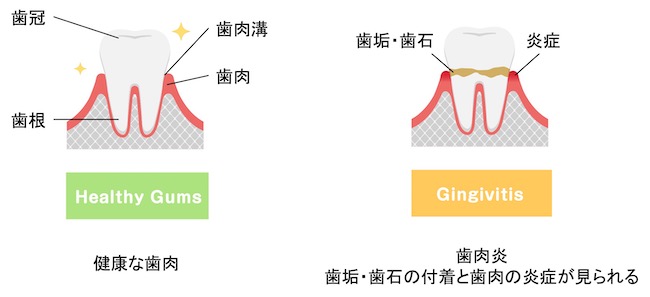 歯周病とは歯と歯肉の隙間(歯肉溝)で歯周病菌が増殖することで歯周組織に炎症・破壊を引き起こす進行性の疾患です。歯周病菌は歯垢(プラーク)を形成し、歯垢にミネラル成分が結合することで歯石となります。歯石自体は悪さをするわけではありませんが、歯石があることでさらなる歯垢が付着しやすくなったり、歯周病菌が繁殖しやすい環境になります。