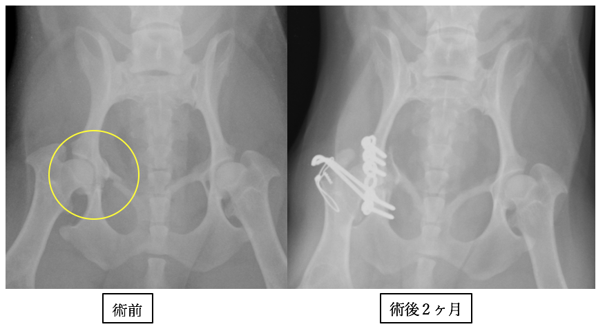 ポメラニアンの骨盤骨折です。両側で骨折しており、手術時間の短縮と固定力の強化のためにロッキングプレート・スクリュー(プレートとスクリューが固定されるシステム)を使用しました。プレート抜去はしなくても良いタイプです。