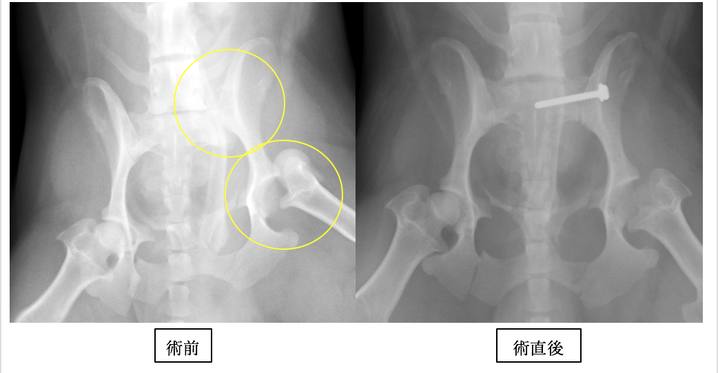 数カ所折れていますが、重要なのは仙腸関節(上の◯)の脱臼と、股関節脱臼です。仙腸関節はラグスクリュー法と呼ばれるスクリューによる固定を行い、股関節は大腿骨頭切除術と呼ばれる方法を行っています。