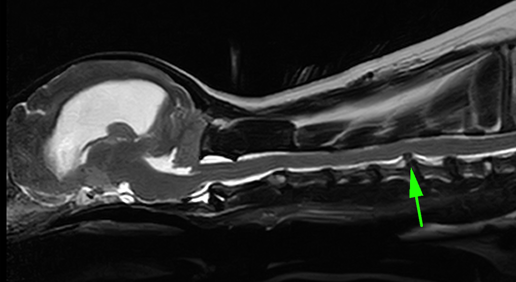 頚部椎間板ヘルニアは頚椎という首の骨をつなぐ椎間板物質が背側に飛び出してしまうことで、そこの神経を圧迫し、疼痛や麻痺を引き起こす疾患です。診断は触診や神経学的検査、レントゲン検査に加え、MRI検査が必須となります。