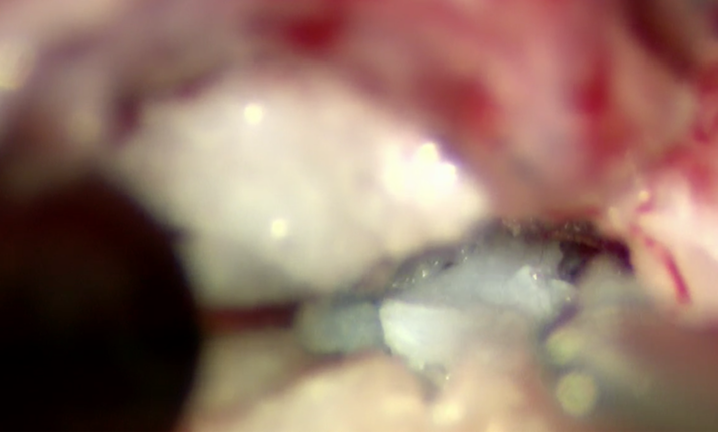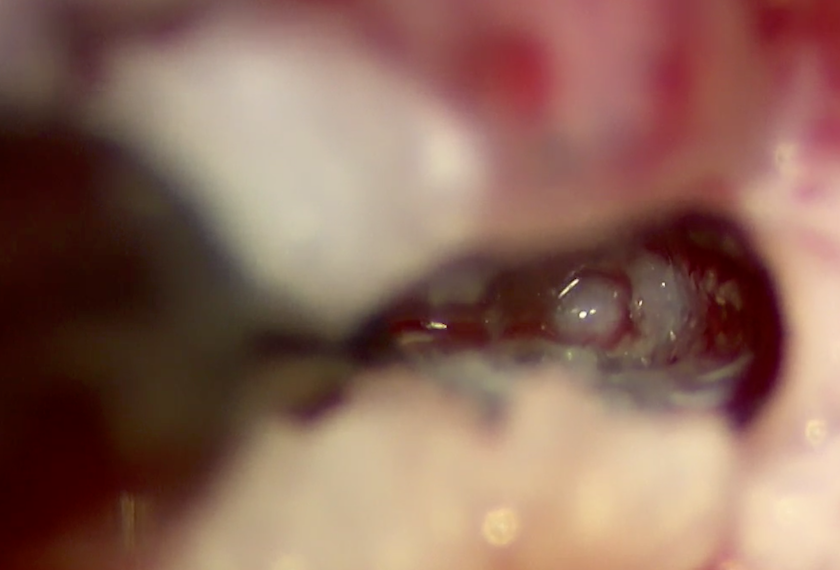 今回の症例では骨の幅が9mmであり、削る幅の最大径が3mmでした。それ以上の幅で削ると不安定性が出て合併症のリスクが高くなります。3mmの幅の内部での操作となるため、肉眼での操作は困難であり、顕微鏡操作が有用となります。以下は顕微鏡下での術野の視野になります。