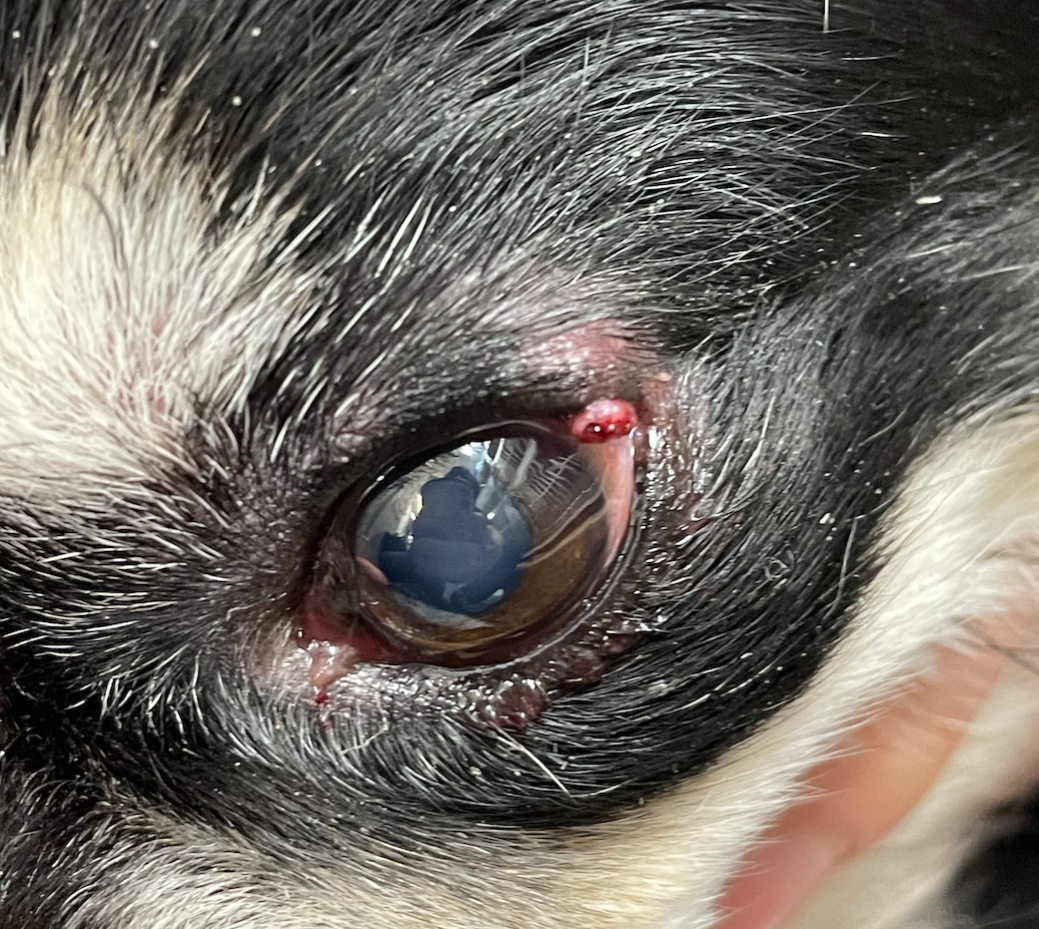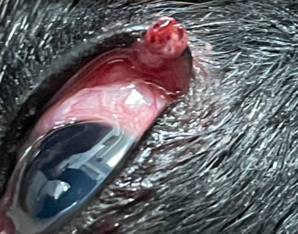 腫瘤のサイズは3mm×2mm程度で、まぶたの外から内側に渡って存在し、腫瘤の一部が眼球結膜に接触し、結膜炎を引き起こしていました。