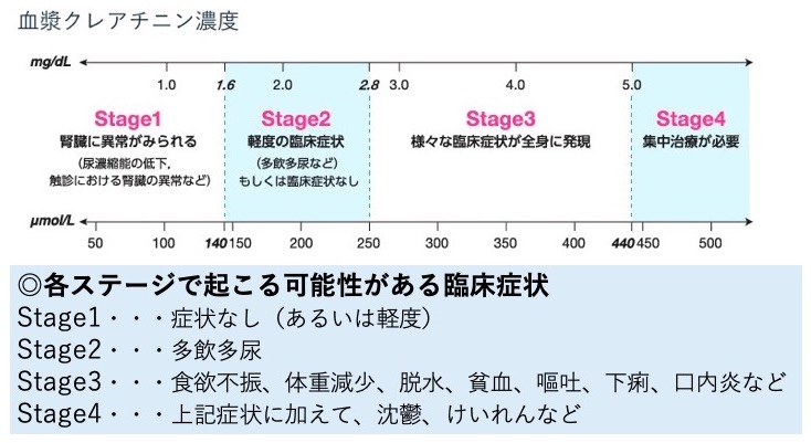 国際獣医腎臓病研究グループ(International Renal Interest Society : IRIS)が症例ごとの治療の決定や予後予測を容易にするために、血中クレアチニン(Cre)濃度を基準にCKDを4つのステージに分類しています。