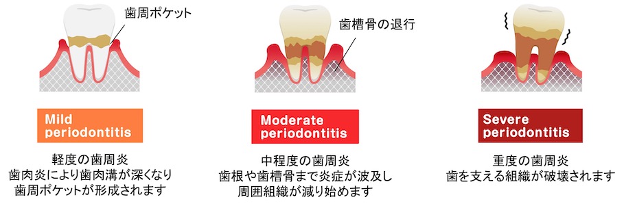 歯周病菌は周囲の歯周組織に炎症を起こします。歯肉に炎症が起こることを歯肉炎と呼びます。軽度の歯肉炎は歯周ポケットの細菌が除去されると治癒する可逆的な炎症ですが、歯肉炎が進行すると歯肉が退行します。さらに悪化すると歯肉だけではなく歯根(歯の根本)や歯槽骨(歯を入れる骨)まで及ぶ歯周炎に進行し不可逆性になります。こうなると歯がぐらぐらしたり抜けたりしてしまいます。
