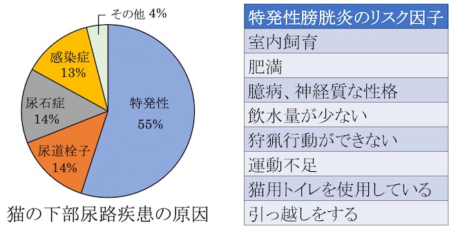 環境改善はトイレの改善が主体となります。トイレが嫌いな猫は排尿を我慢することにより蓄尿時間が長くなるため発症・悪化要因となります。トイレが嫌いな猫は排泄の前に砂をかかない、排泄の後埋めない、トイレから逃げる、トイレの淵に立つなどの行動が見られます。